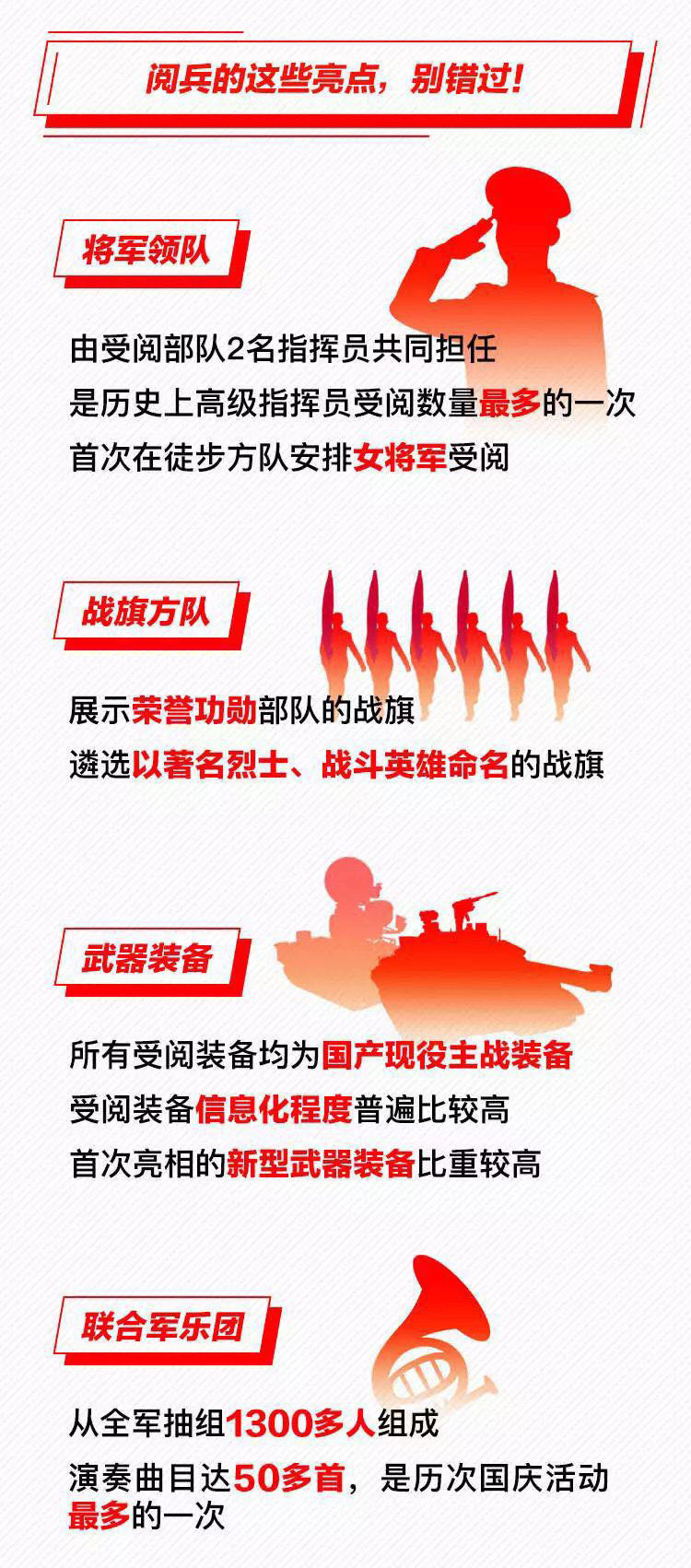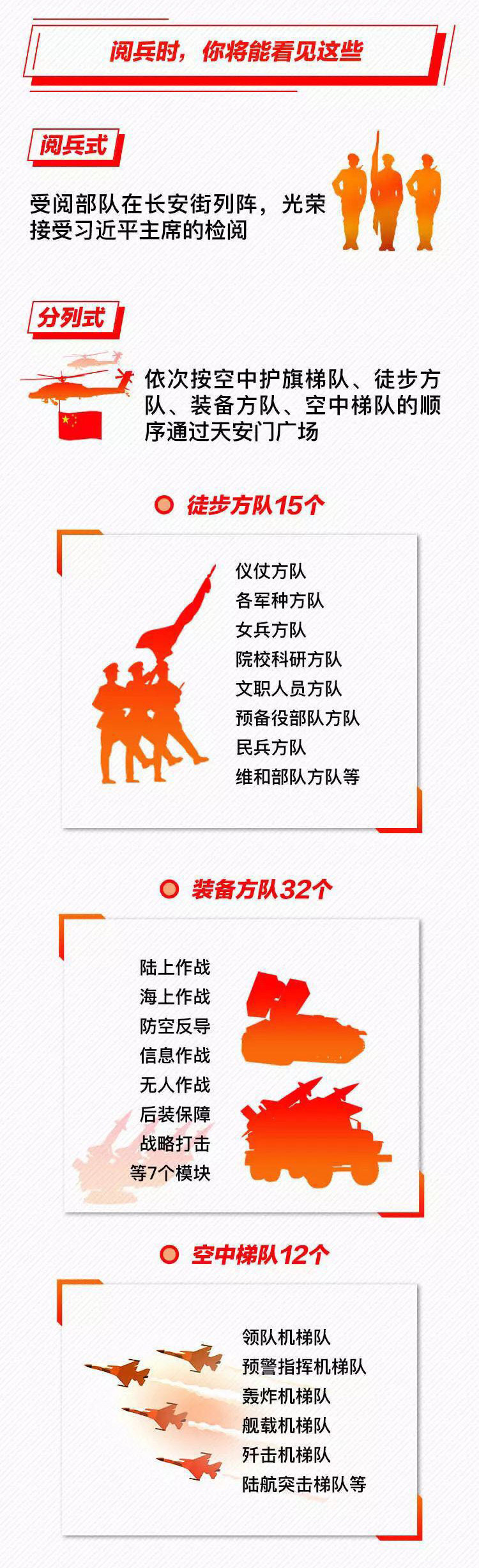 為慶祝新中國成立70周年,10月1日北京天安門廣場將舉行盛大閱兵式。屆時,32個裝備方隊(duì)、12個空中梯隊(duì)將通過天安門廣場,接受檢閱。此次閱兵,所有受閱裝備均為國產(chǎn)現(xiàn)役主戰(zhàn)裝備,其中包括我軍部分新型裝備,是近幾次閱兵中規(guī)模最大的一次。 強(qiáng)國必須強(qiáng)軍,強(qiáng)軍必須利器。作為我軍機(jī)械化、信息化、智能化裝備發(fā)展的骨干,全軍毀傷打擊的核心支撐和現(xiàn)代化新型陸軍體系作戰(zhàn)能力科研制造的主體,此次國慶閱兵式,兵器工業(yè)集團(tuán)研制生產(chǎn)的16型裝備將接受黨和人民的檢閱,分布在受閱裝備方隊(duì)7個模塊中的陸上作戰(zhàn)、防空反導(dǎo)、信息作戰(zhàn)、無人作戰(zhàn)、后裝保障五個模塊、32個方隊(duì)中的12個方隊(duì),集中展示了兵器工業(yè)集團(tuán)履行強(qiáng)軍首責(zé)、自主創(chuàng)新的最新成果。 10月1日大閱兵 我們準(zhǔn)備好了 |