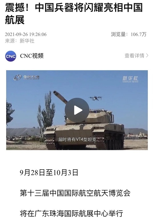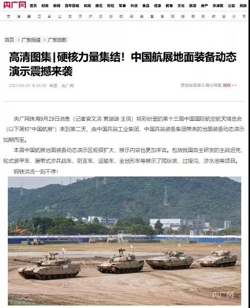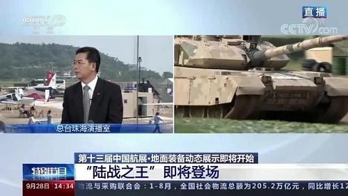 9月28日-10月3日,第十三屆中國國際航空航天博覽會在廣東珠海舉行,中國兵器工業(yè)集團有限公司作為主辦單位閃耀亮相,推出裝甲突擊、火力打擊、智能彈藥、防空反導、無人裝備、非傳統(tǒng)安全、軍工軍技合作等領(lǐng)域新產(chǎn)品及成體系成建制武器系統(tǒng)和解決方案,全方位展示我國陸軍外貿(mào)武器裝備的最高水平以及雄厚的科技創(chuàng)新、自主研發(fā)與先進制造能力,受到廣泛關(guān)注。 央視《新聞聯(lián)播》報道第十三屆中國航展,著重介紹了VT4主戰(zhàn)坦克,關(guān)注航展公眾日中國兵器館情況。9月28日下午央視《新聞直播間》航展特別節(jié)目《藍天盛會》邀請集團公司訪談嘉賓做客直播間對中國兵器館兵器工業(yè)集團展區(qū)等進行1小時直播;9月28日下午、10月2日下午分別對地面裝備動態(tài)表演進行兩場直播。央視《朝聞天下》、《新聞直播間》、《共同關(guān)注》、《天下財經(jīng)》、《軍事報道》、《正午國防軍事》、《軍武零距離》等相繼推出集團公司參展裝備的報道。