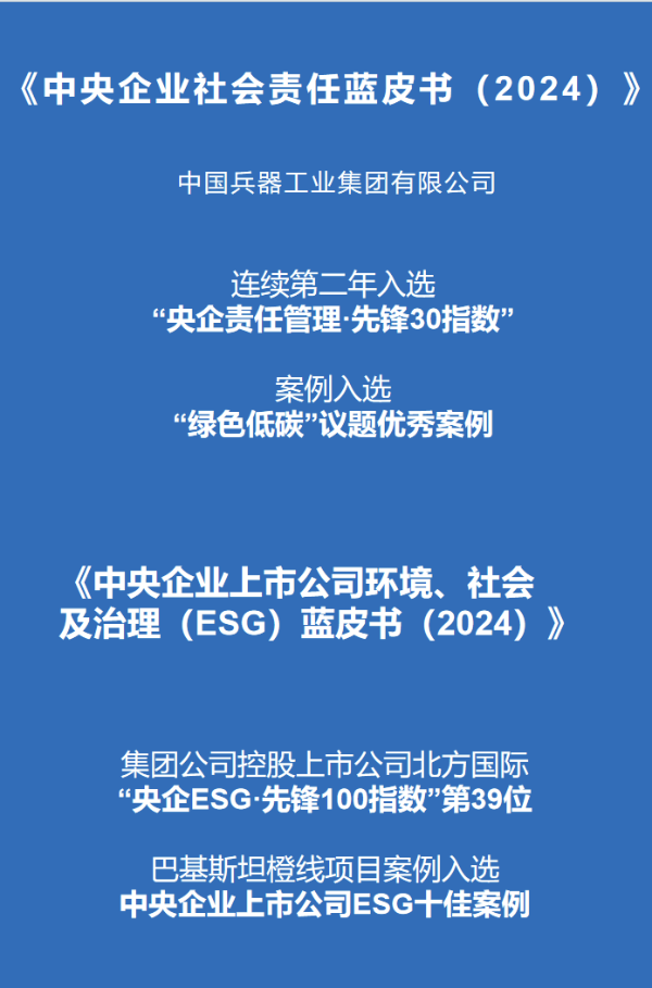 11月7日至8日,由國務院國資委主辦的“第七屆中國企業(yè)論壇之國有企業(yè)社會責任平行論壇”和2024中國企業(yè)新媒體年會在京舉行。 國有企業(yè)社會責任平行論壇現場發(fā)布了《中央企業(yè)社會責任藍皮書(2024)》《中央企業(yè)海外環(huán)境、社會及治理(ESG)藍皮書(2024)》《中央企業(yè)上市公司環(huán)境、社會及治理(ESG)藍皮書(2024)》等系列成果。其中,集團公司連續(xù)第二年入選“央企責任管理·先鋒30指數”榜單,集團公司案例入選“綠色低碳”議題優(yōu)秀案例,所屬控股上市公司北方國際入選“央企ESG·先鋒100指數”第39位,巴基斯坦橙線項目案例入選中央企業(yè)上市公司ESG十佳案例。